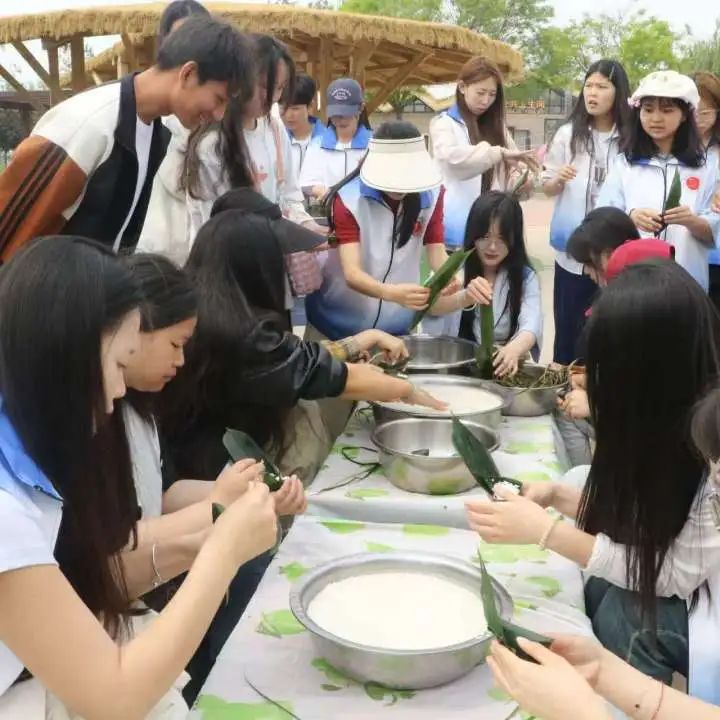 上午,师生们抵达风光秀丽的绕阳湖风景区。清新的空气与秀美的湖光瞬间点燃了学子们的热情。活动在充满节日仪式感的包粽子环节中率先开场。糯米、粽叶等材料整齐摆开,同学们围坐一圈,兴致勃勃地动起手来。对于许多外省学子而言,亲手包粽子是一次新奇而珍贵的文化初体验。迅速包出棱角分明的粽子,吸引了好奇的游客小朋友围观。在大家的热情邀请与耐心教学下,小朋友们也尝试包出了承载情谊的小粽子,现场洋溢着浓浓的端午氛围与互助温情。
