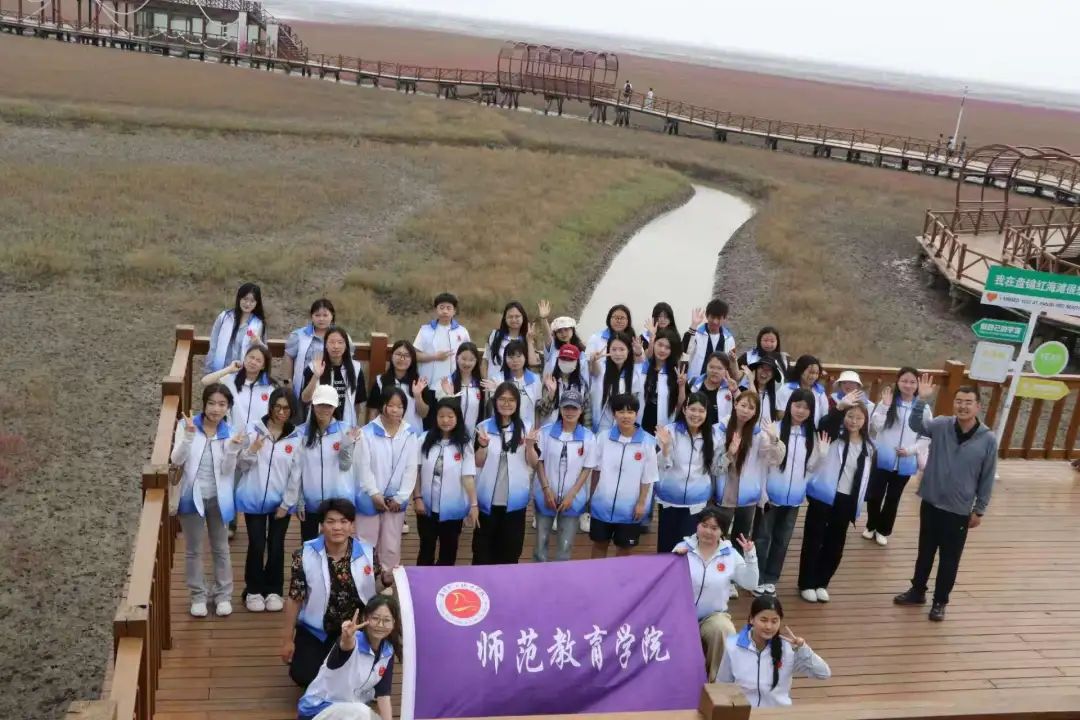 为了让外省学子更深入地领略盘锦“湿地之都”“五色盘锦”的独特魅力,下午,师生们前往红海滩国家风景廊道。在这里,同学们亲身感受到了大自然的神奇造化:广袤无垠、被誉为“地球之肾”的绿色芦苇荡随风摇曳,生机盎然; 而举世罕见的红海滩,在初夏阳光的映照下,碱蓬草织就的嫣红“地毯”与碧水蓝天交相辉映,构成了一幅壮丽的生态画卷。漫步红海滩边,同学们沉浸式体验着自然奇观与湿地文化交融的魅力,对盘锦这座城市独特的生态价值与自然风光有了更深的认识与由衷的热爱。