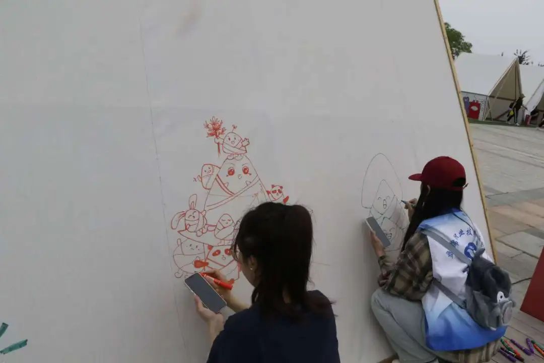紧接着,创意帐篷绘画让大家的艺术细胞得以释放。憨态可掬的卡通形象、温馨的端午祝福语、象征节日的粽子与龙舟图案纷纷跃然“篷”上,素白帐篷瞬间变身绕阳湖畔一道亮丽的五彩风景线。此时,湖畔乐队奏响了激昂的鼓点与悠扬旋律,同学们沉醉其中,随乐挥手。演出结束后,大家踊跃登台献唱,现场气氛热烈欢腾。音乐余韵未消,欢乐的接力取零食游戏又激情上演,获胜小组的欢呼声此起彼伏。