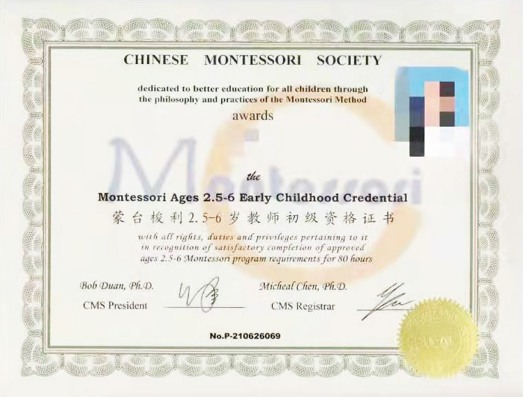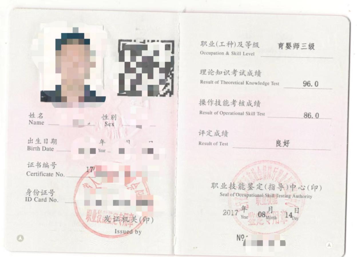 小学教师资格证书、珠心算等级证书、蒙台梭利教师资格证书、心理咨询师资格证书、育婴员证书等。