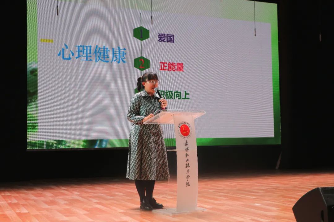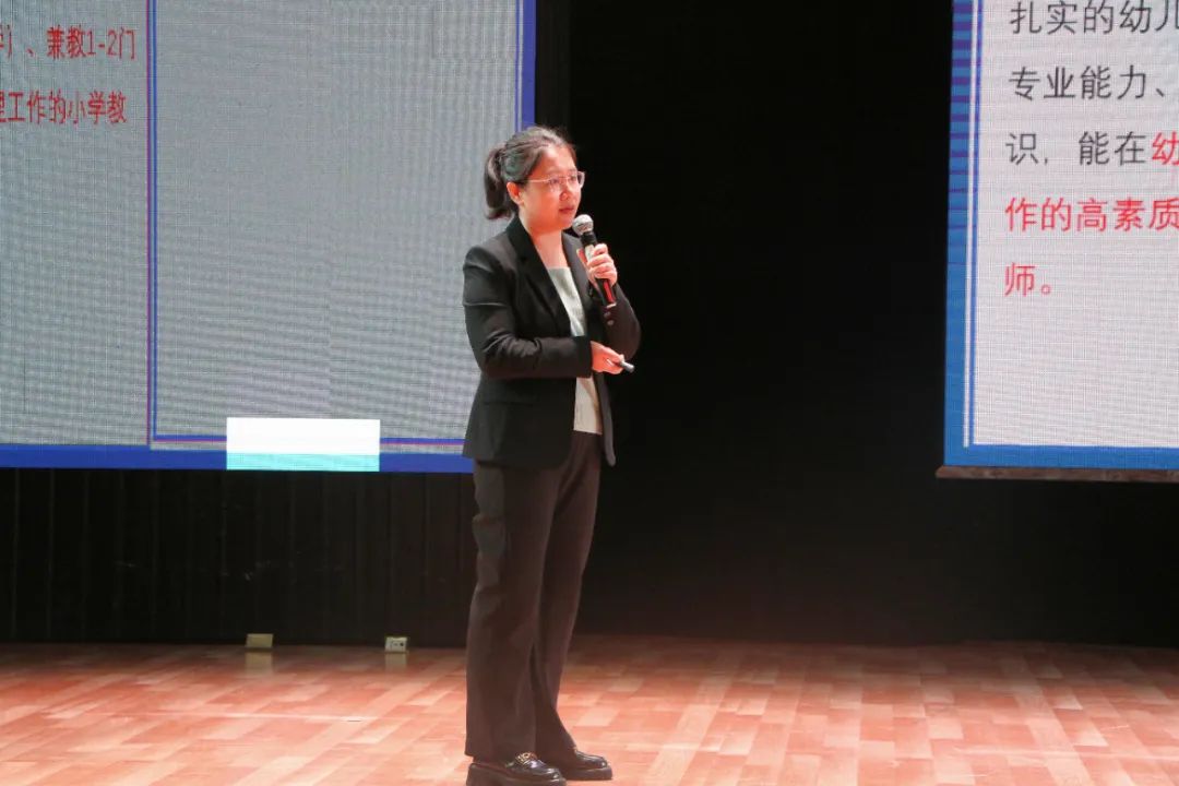 沈娇副院长做了《鲜衣怒马少年时,不负韶华行且知》主题报告,鼓励同学们明确目标、脚踏实地,叮嘱同学们要保持身心健康,更强调了师德与个人修养的重要性,希望同学们热爱祖国、家乡和学校。沈副院长以“优品质、强技能、好习惯、健身心”的学校育人目标做结尾,并鼓励同学们牢记并践行“德艺周厚,知行合一”的校训和“学高为师,身正为范”的院训。最后祝愿同学们学业有成、梦想成真。